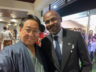 Ma joie est d'autant plus immense car il s'agit de la toute première fête nationale du Japon que nous organisons à la Nouvelle résidence dont les travaux ont pris fin en janvier dernier, grâce aux efforts combinés de l'Ambassade, de la société japonaise TODA Corporation ainsi que de plusieurs collaborateurs congolais et des pays tiers. Ils ont apporté une contribution déterminante à l'achèvement des travaux, n'hésitant pas à travailler durant les vacances de Noël comme les week-ends. Je souhaite, à ce stade, vous présenter Monsieur Sawada, Deuxième Secrétaire, ainsi que le représentant de Toda Corporation. Monsieur Sawada a suivi ardement la réalisation de la nouvelle résidence jusqu'à son achèvement et rejoindra son nouveau poste au Paraguay dans une semaine où est attendu un autre grand projet de construction.