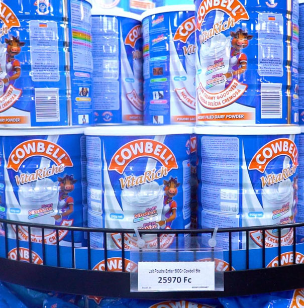 «Le prix du Cowbell 30, qui était de 54.000 FC, est aujourd’hui à 51.300 FC. Pour celui de 15 grammes (Cowbell grand format ou plasma), le prix a baissé de 126.900 FC à 120.600 FC. Quant au lait Mixwell de 25 kg, son prix est passé de 104 $ à 100.80 $. Ces mesures viennent d’une part soulager la population et faciliter d’autre part une vente plus rentable pour les commerçants», explique ce marchand.