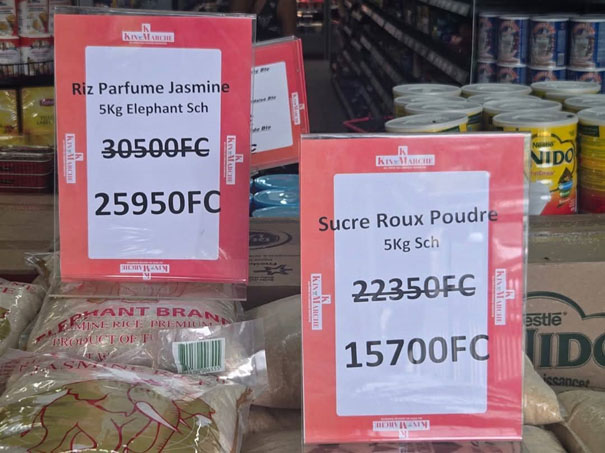 Le prix du riz de la même portion a été réduit de 30.500 FC à 22.000 FC. De même, le lait, qui était à 28.000 FC, se vend maintenant à 22.500 FC. Ces produits ont subi une réduction de 10 à 50 %.