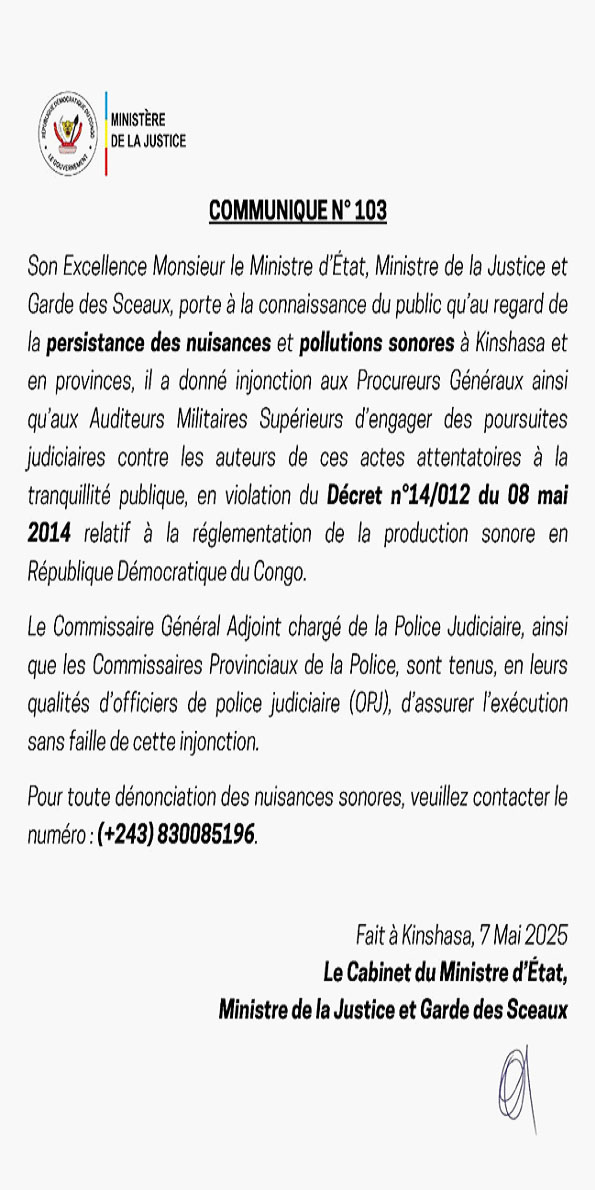 Le ministère de la Justice et Garde des Sceaux hausse le ton face à la persistance des nuisances et de pollution sonores dans la capitale congolaise et à travers les provinces. Par un communiqué officiel n°103 daté du mardi 7 mai, Constant Mutamba a instruit les "Procureurs généraux ainsi que les Auditeurs militaires supérieurs d'engager des poursuites judiciaires contre les auteurs" de ces troubles "à la tranquillité publique".