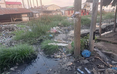 Ici, le bitume a cédé la place à une mare noire, traversée par un caniveau bouché depuis des mois. Des bouteilles en plastique, des sacs, des restes de cartons et d'ordures ménagères s'y entassent, empêchant toute circulation de l'eau. Sous le soleil, ce mélange dégage une odeur insupportable, qui pénètre les maisons, envahit les étals et rend l'air presque irrespirable.