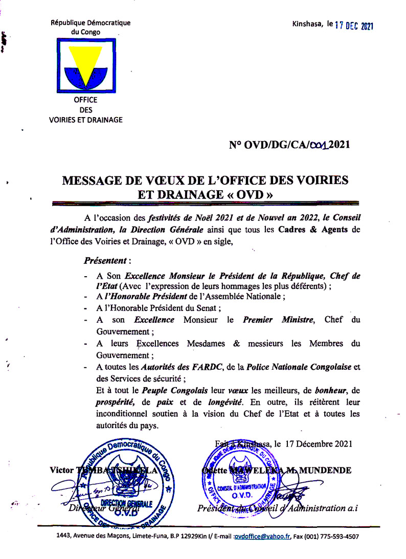 A l’occasion des festivités de Noël 2021 et de Nouvel an 2022, le Conseil d’Administration, la Direction Générale ainsi que tous les Cadres & Agents de l’Office des Voiries et Drainage, » OVD » en sigle,
