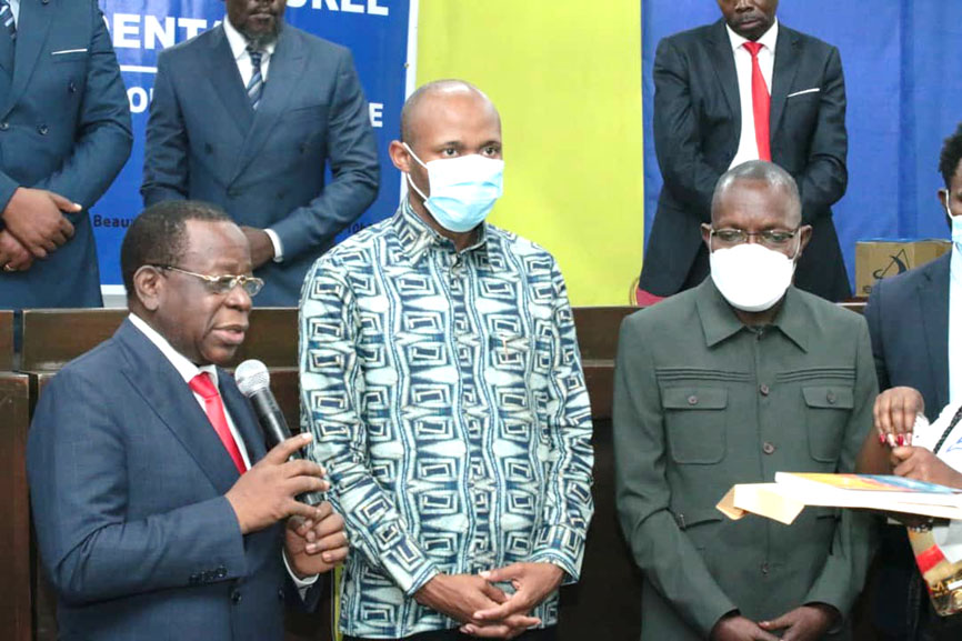 Modeste Bahati porte sur les fonts baptismaux le livre du Pr Frédéric Adalbert Kinkani