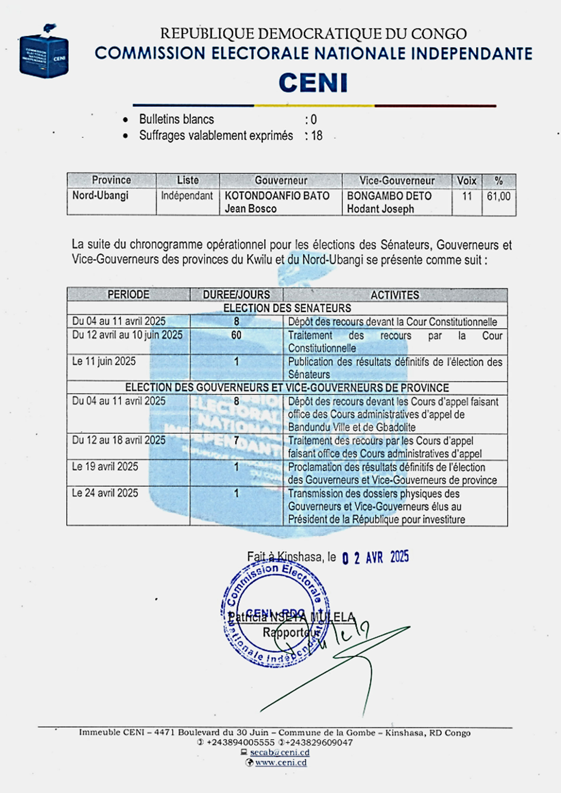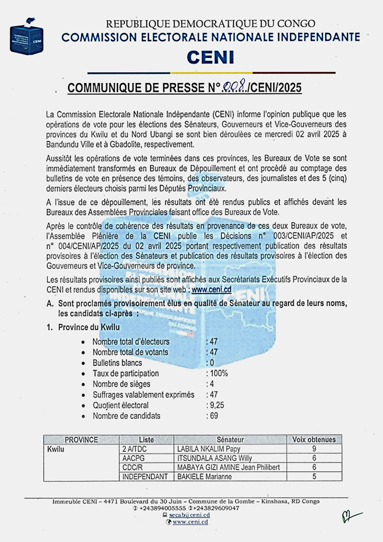 La commission électorale nationale indépendante (CENI) a publié hier mercredi 2 avril, la liste provisoire des sénateurs et gouverneurs élus des provinces du Nord-Ubangi et du Kwilu.