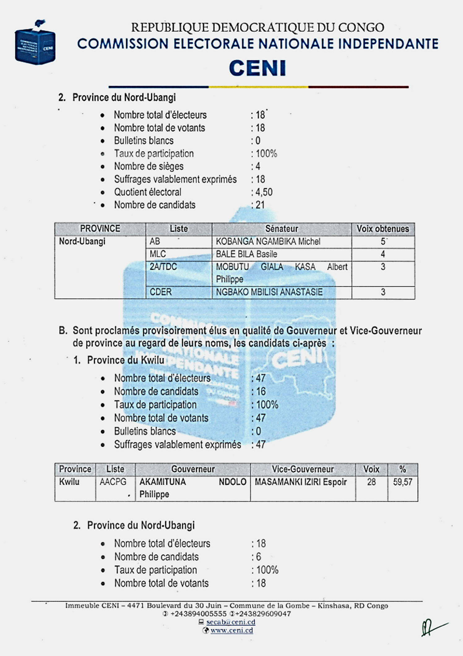 Nord-Ubangi et Kwilu : voici les sénateurs et gouverneurs élus