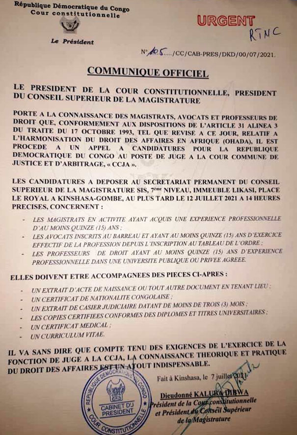 Les professeurs de Droit, les magistrats et avocats congolais sont appelés à postuler au poste de juge à la Cour Commune de Justice et d’Arbitrage (CCJA), la plus haute juridiction du Droits des Affaires en Afrique, instituée par l’Organisation pour l’Harmonisation du Droits des Affaires en Afrique (OHADA).