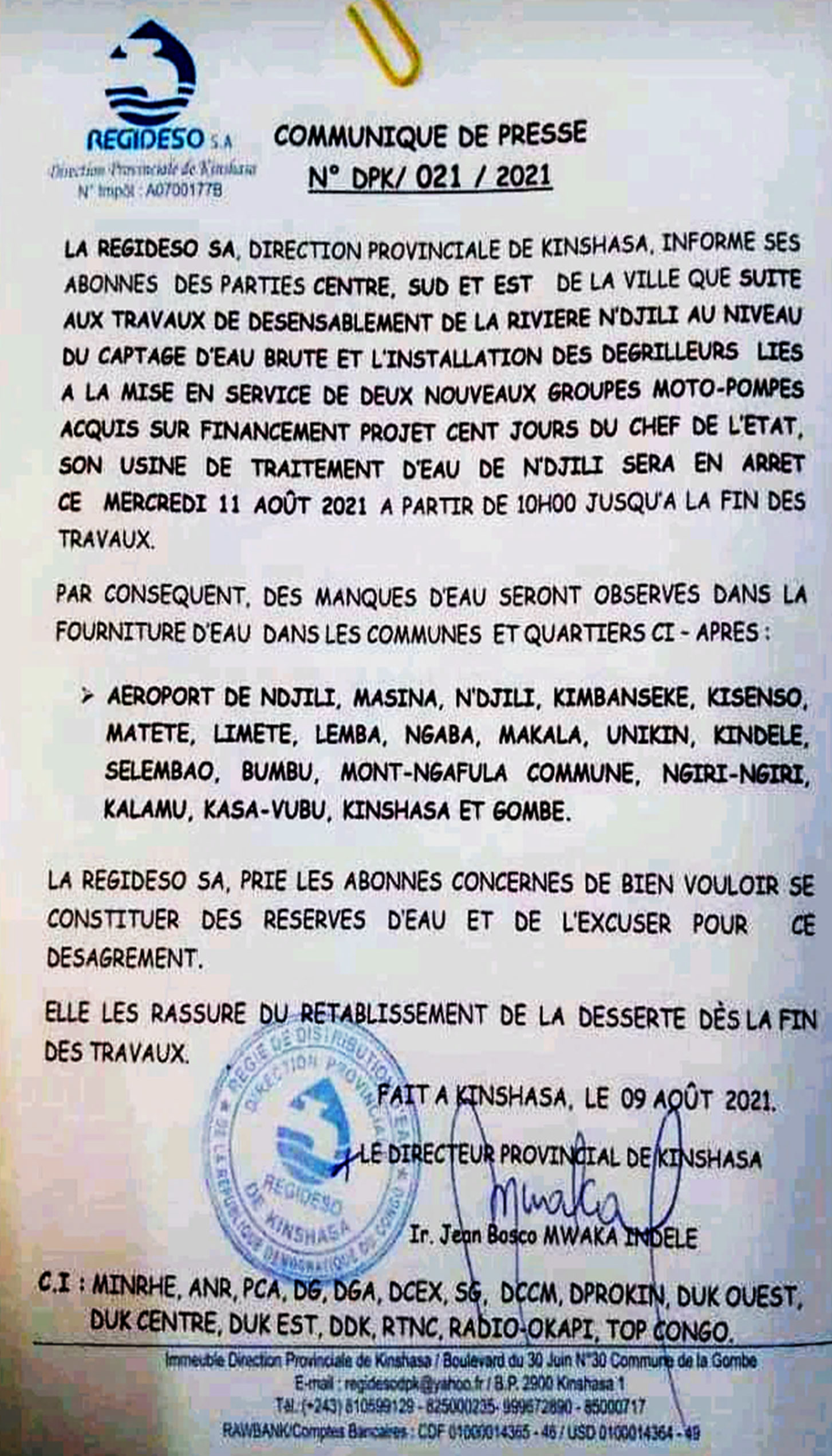 Il s’agit des quartiers et communes de Aéroport international de N’Djili, Bumbu, Gombe, Kalamu, Kasa-Vubu, Kimbanseke, Kindele (Mont-Ngafula), Kinshasa, Kisenso, Lemba, Limete, Makala, Masina, Matete, Mont-Ngafula commune, N’Djili, Ngaba, Ngiri-Ngiri, Selembao et Unikin (Lemba). C’est ce qu’annonce la Régideso, dans un communiqué signé lundi dernier, par son directeur provincial, Jean-Bosco Mwaka Indele.