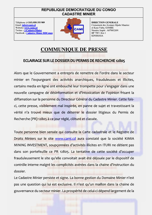 Dans un communiqué de presse daté du dimanche 19 septembre, parvenu à Forum des As, le Département de Communication du Cadastre minier apporte l’éclairage sur le dossier litigieux du Permis de recherche 12805. Un dossier, selon le Cadastre minier, déjà » réglé, clôturé et classé » mais déterré malencontreusement par certains médias. Un clic sur la Carte cadastrale et le Registre des droits miniers sur le www.cami.cd renseigne que la société Kimia Mining Investment, soupçonnée d’activités en Ituri ne détient pas dans son portefeuille ce Permis de recherche 12805. Lire, ci-dessous, le communiqué de presse du CAMI à ce sujet.