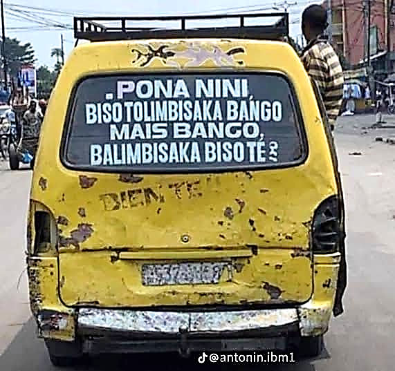 "Pona nini biso tolimbisaka bango, mais bango balimbisaka biso te ". Traduisez : "Pourquoi nous leur pardonnons, mais eux ne nous pardonnent pas ? " Il a plu à un des nos confrères de nous envoyer ce message écrit sur le pare-brise arrière d'un véritable tacot de marque Hiace, de couleur jaune, comme pour dire qu'il s'agit d'un véhicule des transports en commun. D'apparence très sale, le véhicule est d'une couleur décrépie par le temps, tandis que le temps a aussi eu raison de son numéro d'immatriculation devenu pratiquement invisible. Ce qui n'enlève rien à l'importance du message du véhicule.