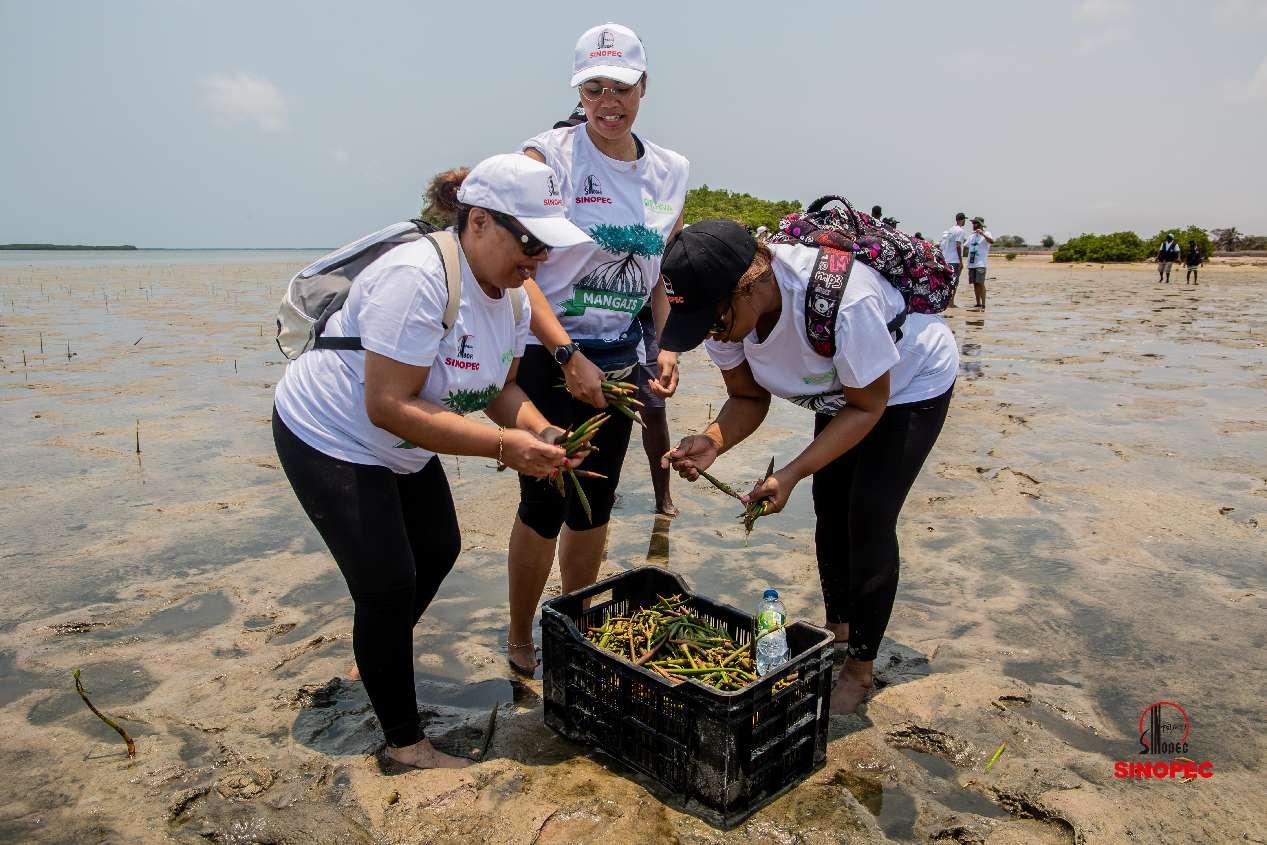 Des employés de la succursale angolaise de Sinopec International Petroleum Exploration and Production Corporation (SIPC) plantent des semences de mangrove sur une plage. (Photo Zhao Xuchi)