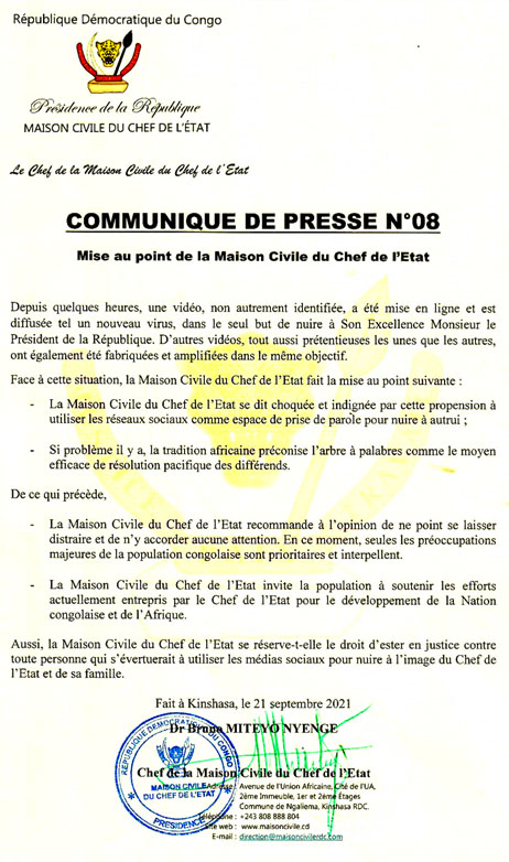 Toutefois, la Maison civile du chef de l’État recommande à l’opinion de ne point se laisser distraire et de n’y accorder aucune attention. Elle rappelle aussi que seules les préoccupations majeures de la population congolaise demeurent prioritaires.