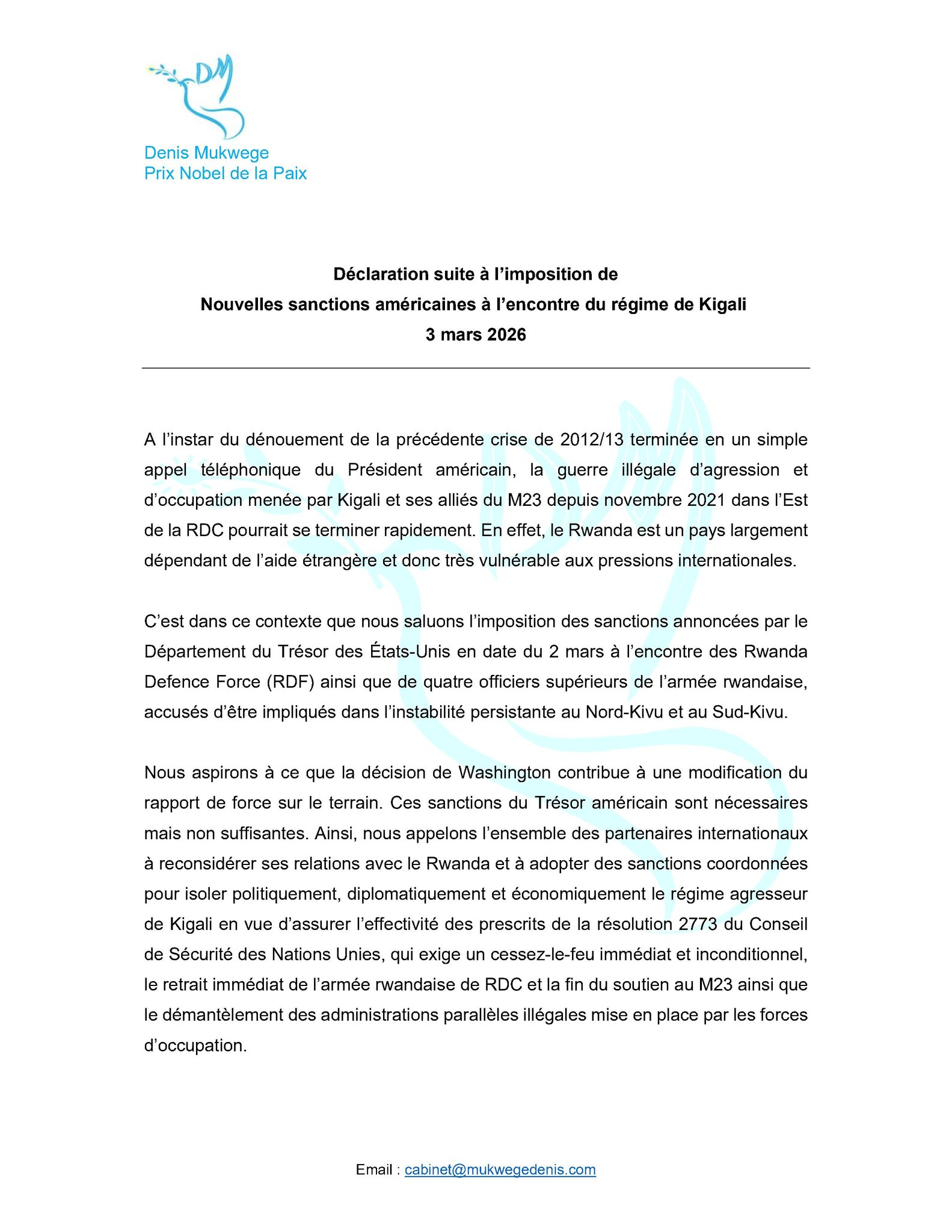 Le médecin congolais appelle l’ensemble des partenaires internationaux à « reconsidérer leurs relations avec le Rwanda » et à adopter des sanctions coordonnées pour « isoler politiquement, diplomatiquement et économiquement le régime agresseur de Kigali ».
