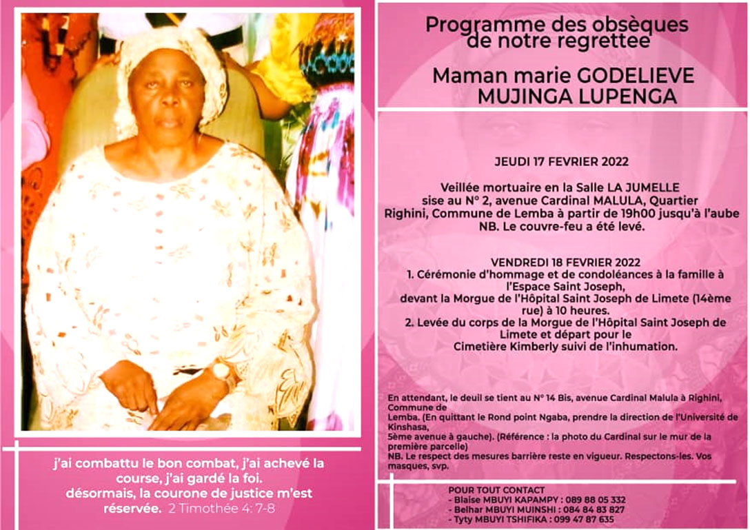 Programme des obsèques de notre regrettée Maman Marie Golelieve mujinga lupenga