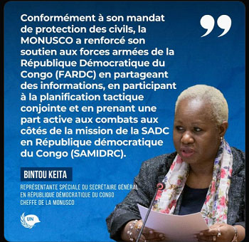 La cheffe de la MONUSCO, Bintou Keita, a exhorté le Conseil de sécurité des Nations Unies à agir pour protéger les civils, les humanitaires et le personnel onusien, tout en réitérant le soutien de la Mission aux FARDC.
