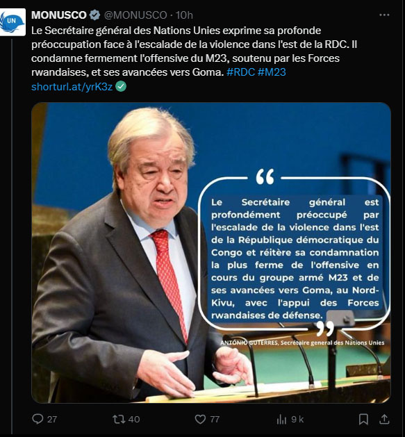 "Le Secrétaire général des Nations Unies exprime sa profonde préoccupation face à l'escalade de la violence dans l'est de la RDC. Il condamne fermement l'offensive du M23, soutenu par les Forces rwandaises, et ses avancées vers Goma".