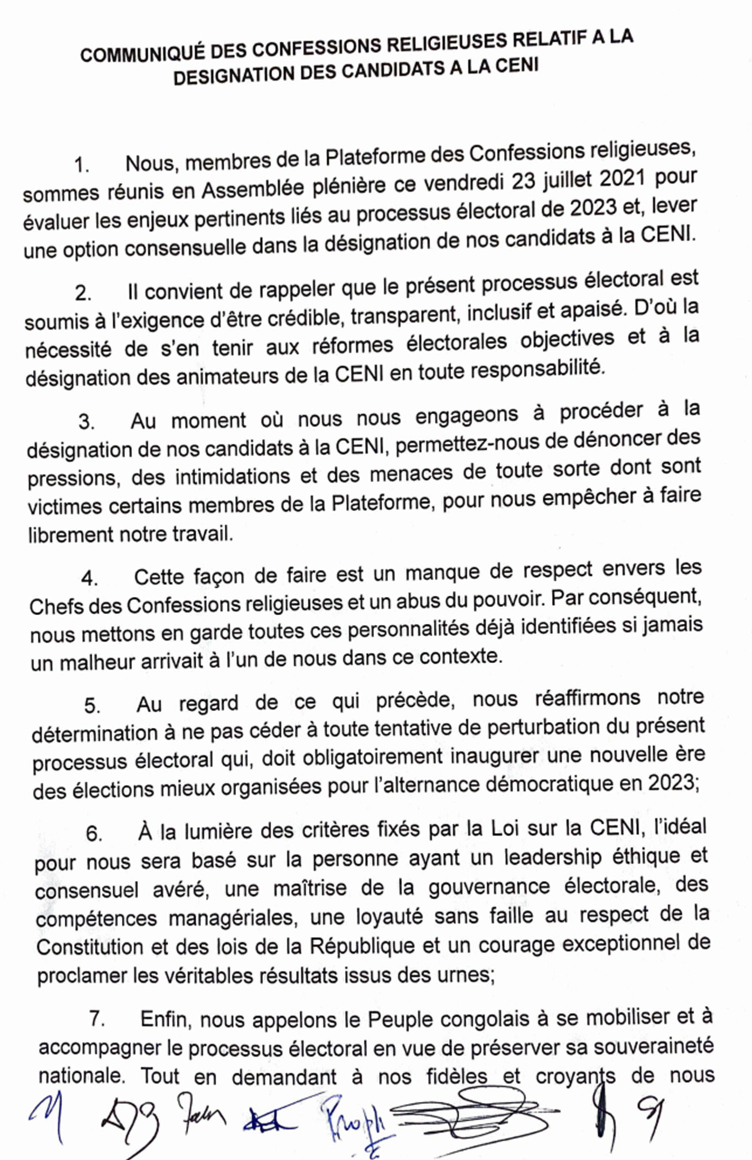 Dans une déclaration à la presse le vendredi 23 juillet, les chefs des confessions religieuses dénoncent « des pressions, des intimidations et des menaces au moment où ils doivent désigner leurs délégués à la CENI« .