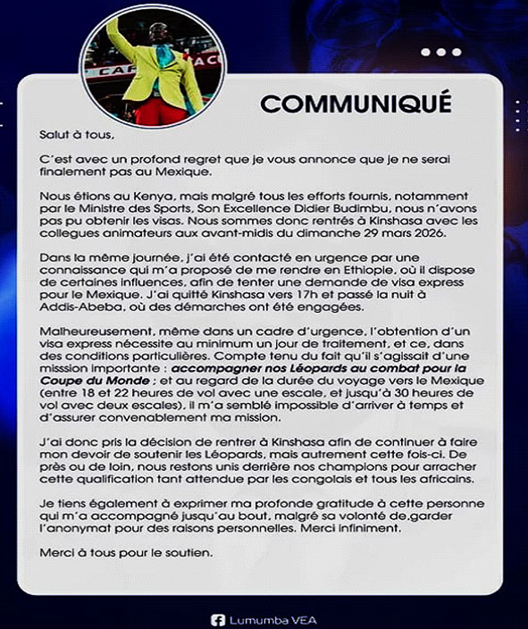 Aucun animateur congolais ne sera à Guadalajara au Mexique pour encourager les Léopards, à l'occasion du match des barrages intercontinentaux du Mondial 2026, qui va opposer les fauves congolais aux Reggae Boyz de la Jamaïque, ce mardi 31 mars à 22h ( heure de Kinshasa). Lumumba Vea, Evoloko, Mundele Ndundu, Thomas et autres vont briller par leur absence, faute de visas, après pourtant plus d'une semaine à Nairobi au Kenya pour des formalités administratives.