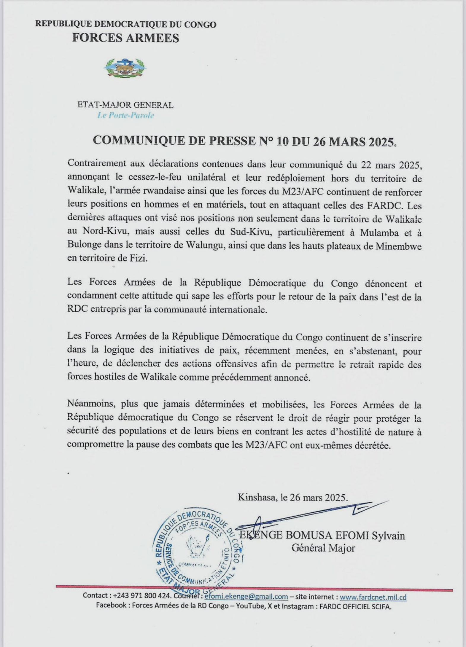 Selon le communiqué, les forces rwandaises et les milices du M23/AFC maintiennent leur offensive, renforçant leurs positions en hommes et en matériel tout en menant des attaques répétées contre les FARDC. Les dernières attaques ont eu lieu dans le territoire de Walikale au Nord-Kivu, ainsi que dans le Sud-Kivu, notamment à Mulamba et Bulonge dans la région de Walungu, et sur les hauts plateaux de Minembwe en territoire de Fizi.