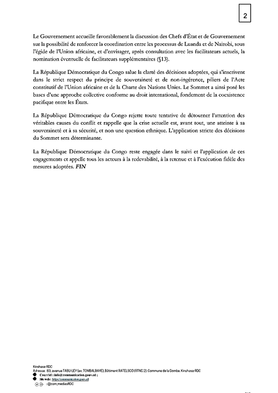 Reconnaissant l’importance des cadres diplomatiques existants, le Sommet a réaffirmé le rôle essentiel des processus de Luanda et de Nairobi. Il a ainsi décidé de les fusionner en un processus unique Luanda/Nairobi, tout en renforçant leurs mécanismes pour assurer une meilleure complémentarité et efficacité dans la résolution du conflit en RDC.