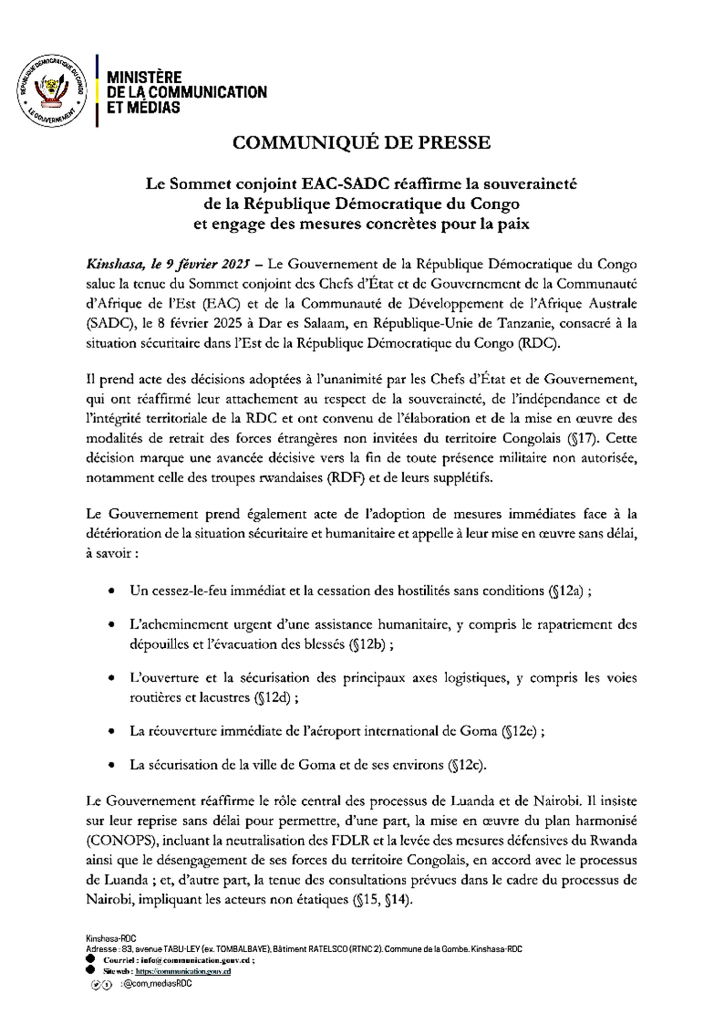 Le Sommet conjoint de la Communauté de développement de l’Afrique australe (SADC) et de la Communauté d’Afrique de l’Est (EAC), tenu à Dar-es-Salaam, en Tanzanie, a ordonné l’élaboration et la mise en œuvre de modalités pour le retrait des forces armées étrangères non invitées du territoire de la République démocratique du Congo.