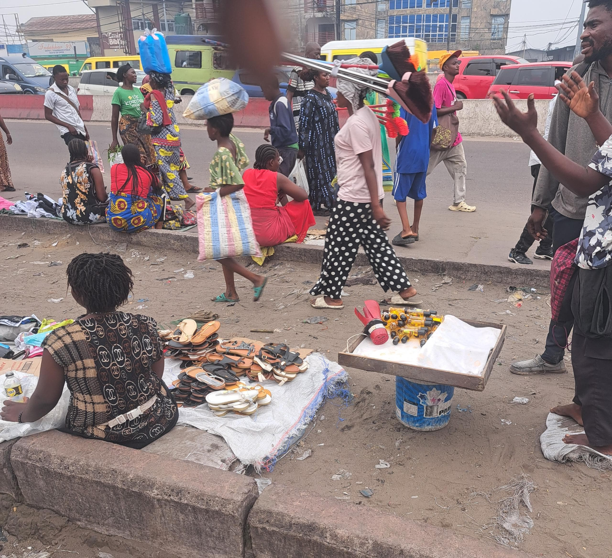 À Kinshasa, le slogan « Bala bala eza wènze te » (la route n’est pas un marché,NDLR) promet l’ordre et la sécurité. Mais dans le district de la Tshangu, la réalité dément ces mots à valeur d'interdiction. Le long du boulevard Lumumba, le bitume est envahi par des étals improvisés, des friperies et des cageots de fruits. Les véhicules et les motos slaloment entre les marchands, les passants se faufilent respirant l’air se chargé de gaz d’échappement. La chaussée, conçue pour la circulation, est transformée en une galerie commerciale à ciel ouvert.