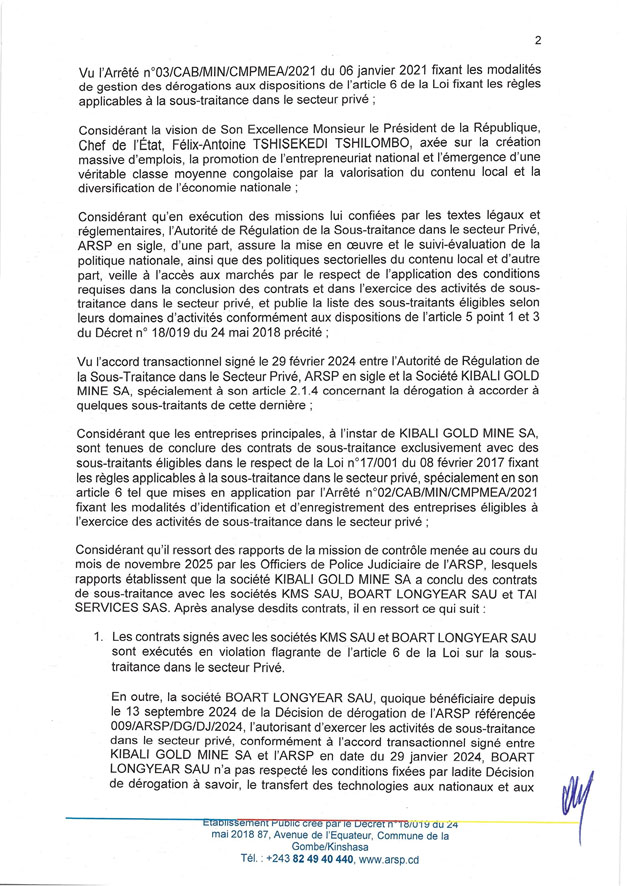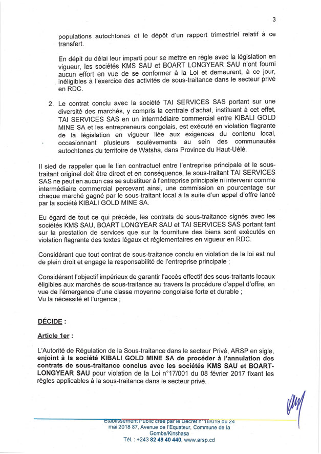 L'Autorité de Régulation de la Sous-traitance dans le Secteur Privé (ARSP) a ordonné l'annulation immédiate des contrats jugés irréguliers, conclus entre Kibali Gold Mine et les entreprises KMS, Boart Longyear ainsi que la centrale d'achat TAI Services.