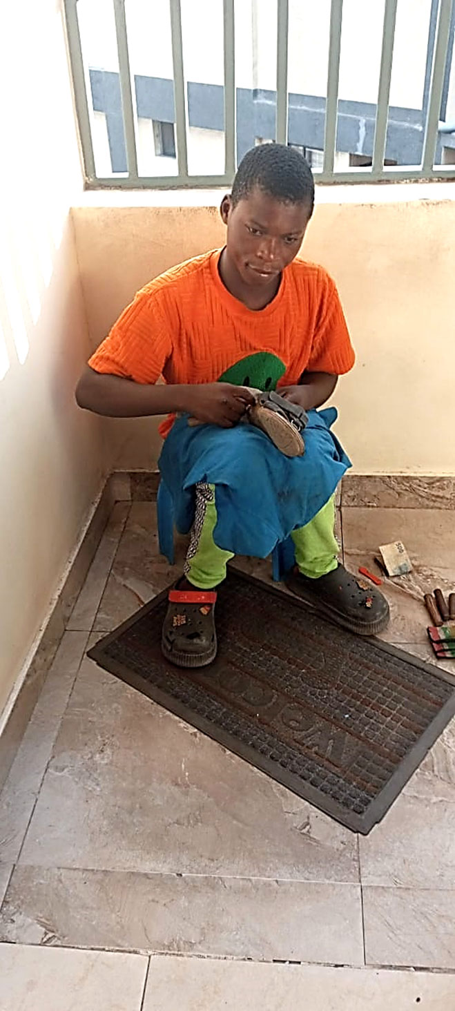 Assis à même le sol, dos au mur d’une boutique, Moïse brave le soleil. Le travail commence. Il cire, répare et embellit des chaussures. Il se fait accompagner de son jeune frère à qui il apprend le métier. Les recettes journalières varient d’un jour à un autre.