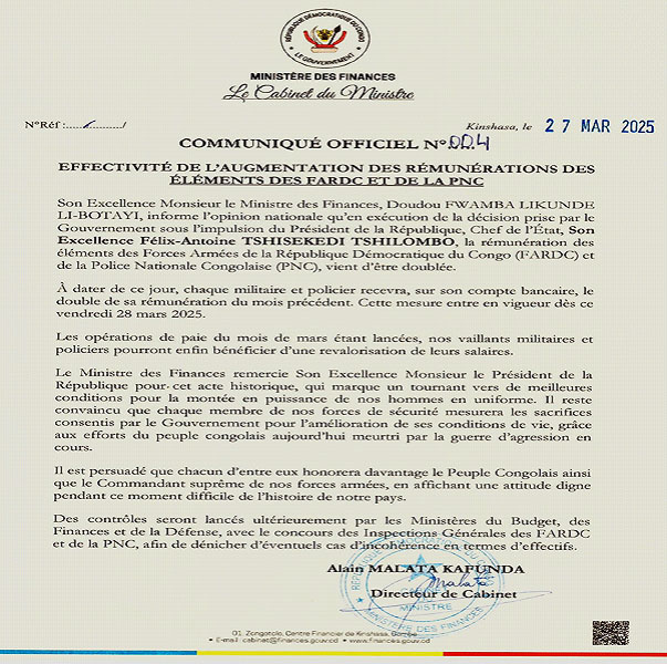 Chose promise, chose faite, l'augmentation de rémunération des éléments des Forces armées congolaises et ceux de la Police Nationale congolaise est effective. Dans un communiqué officiel signé par Alain Malata Kafunda, le directeur de cabinet du Ministre des Finances, chaque militaire et policier a reçu, à la date du vendredi 28 mars, sur son compte bancaire, le double de sa rémunération du mois précédent. Cette mesure est entrée en vigueur depuis le vendredi 28 mars 2025.