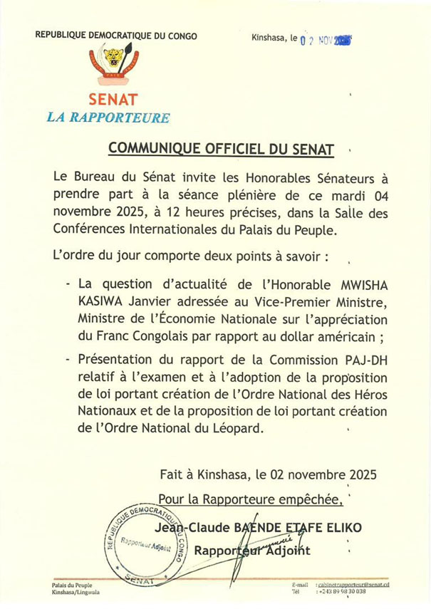 «Le Bureau du Sénat invite les Honorables sénateurs à prendre part à la séance plénière de ce mardi 4 novembre 2025, à 12 heures précises, dans la salle des Conférences internationales du Palais du Peuple. L’ordre du jour (…) : la question d’actualité de l’Honorable Mwisha adressée au vice-Premier ministre et ministre de l’Economie sur l’appréciation du franc congolais par rapport au dollar américain», selon un communiqué signé par le Rapporteur adjoint du Sénat, Jean-Claude Baende.