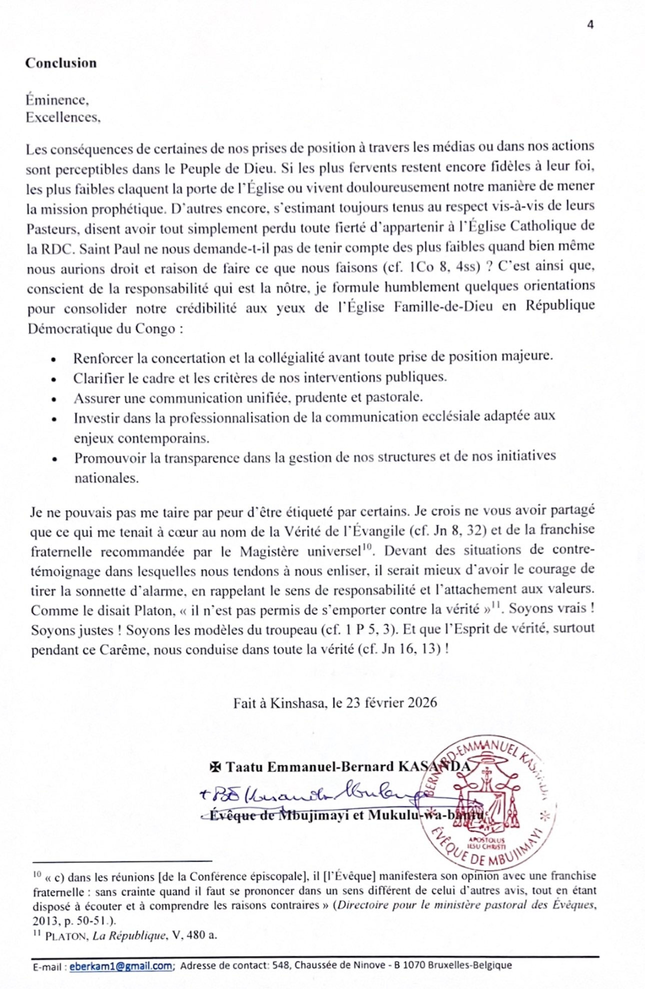 Lors d'une réunion à huis-clos des évêques à Kinshasa le 23 février, Mgr Emmanuel-Bernard Kasanda, évêque de Mbuji-Mayi, critique sèchement "au nom de la vérité de l'Evangile", les actions de la Conférence nationale épiscopale du Congo (CENCO), notamment vis-à-vis de la politique.