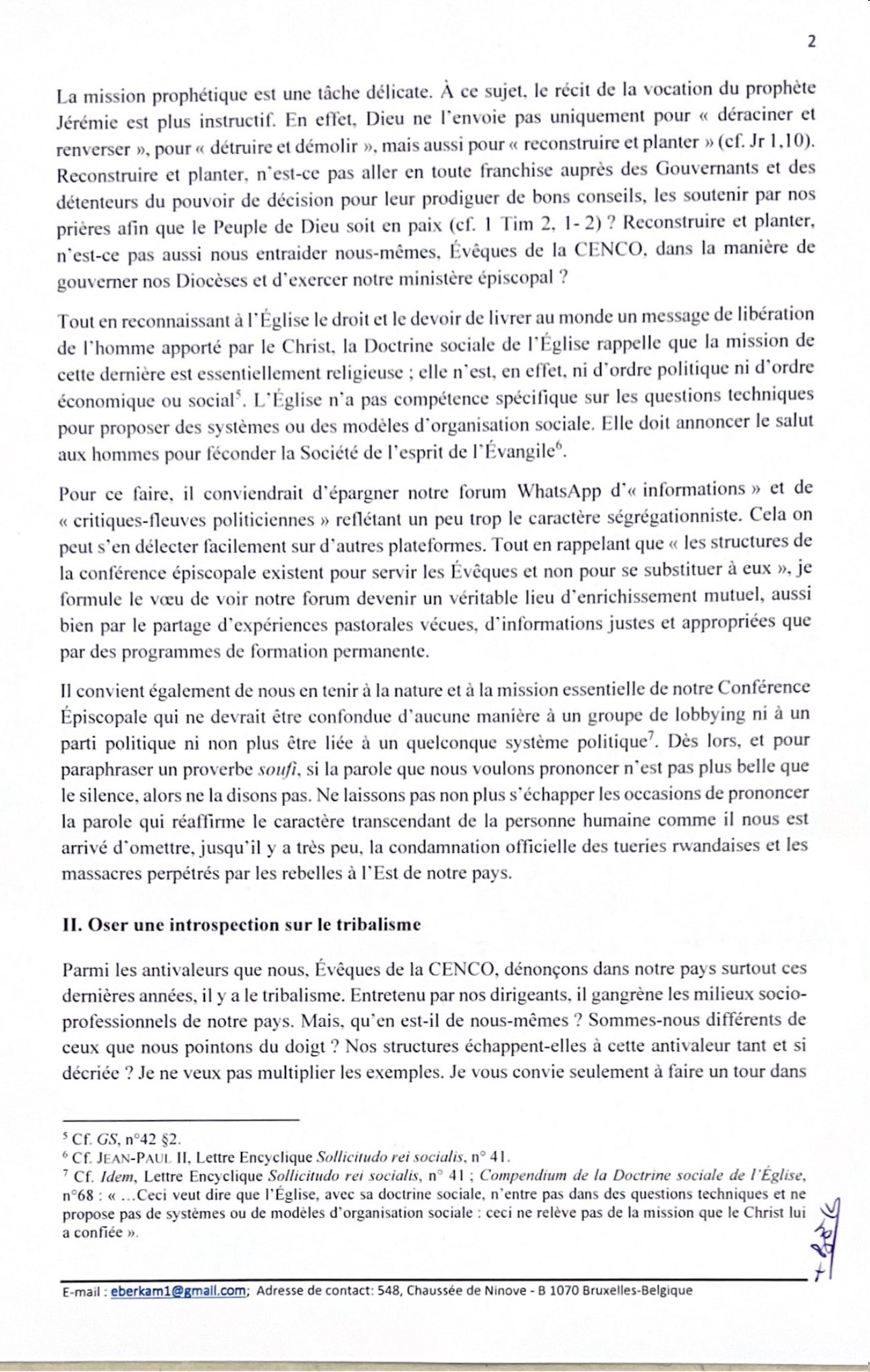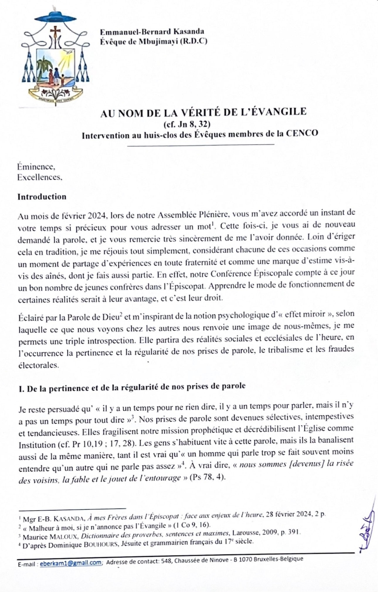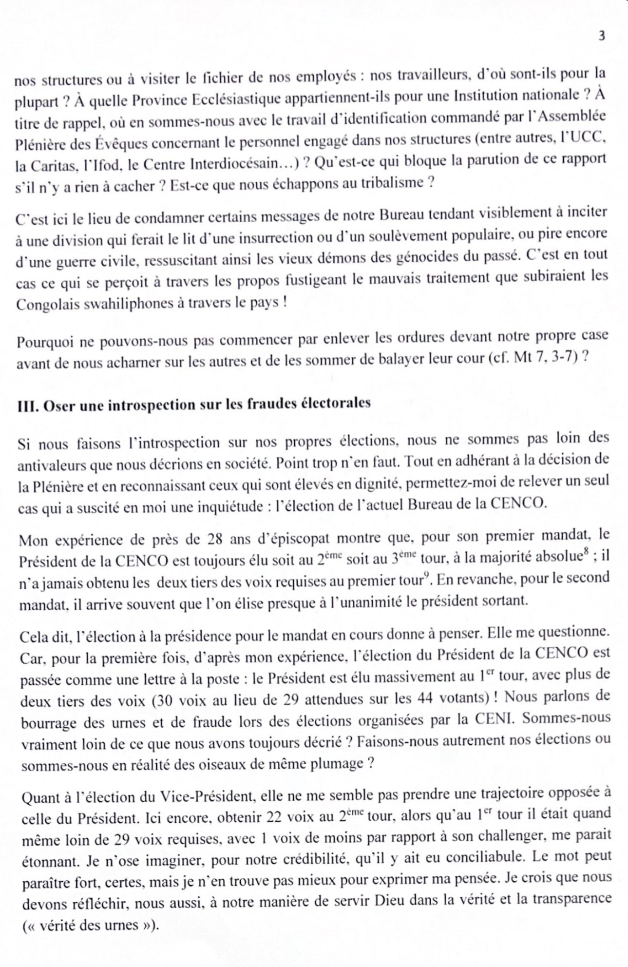 Il dénonce l'omission de la "condamnation officielle des tueries rwandaises et les massacres perpétrés par les rebelles à l'est de notre pays". Pas que. Il soupçonne également des conciliabules dans l'élection du président et vice-président de la Cenco.