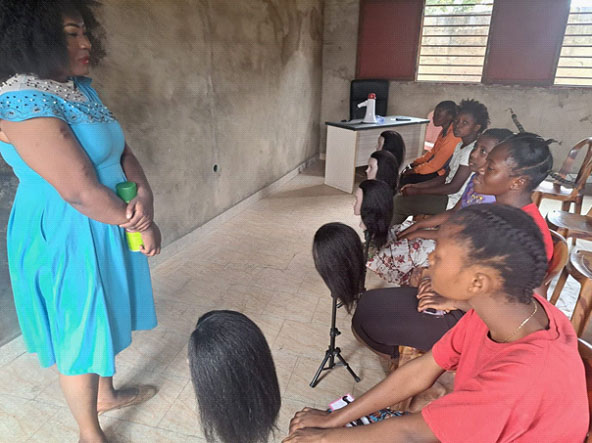 Presque concomitamment, dans la première salle, cinq jeunes filles apprenaient la coiffure sous la direction de Mme Mabanza MaKlistu Pistis, coiffeuse de son état. Dans une démonstration pratique, chacune des apprenantes, munie d'un mannequin chevelu, a assimilé les étapes, l'une après l'autre : comment peigner les cheveux d'une femme, comment faire le chignon, ainsi que les différentes sortes de tresses. Comme au football, des candidates apprenantes dudit métier ne manquent pas. Quelques-unes étaient venues solliciter leur inscription.