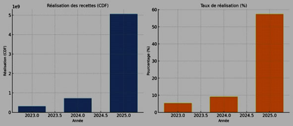 À la date du 30 juin 2025, le niveau des réalisations s'élève à 5.053.212.350 CDF, soit près de sept fois plus qu'en 2024 et plus de seize fois le niveau de 2023. Ce résultat équivaut à 57,41 %, un taux de réalisation inédit qui traduit une avancée majeure en la matière.