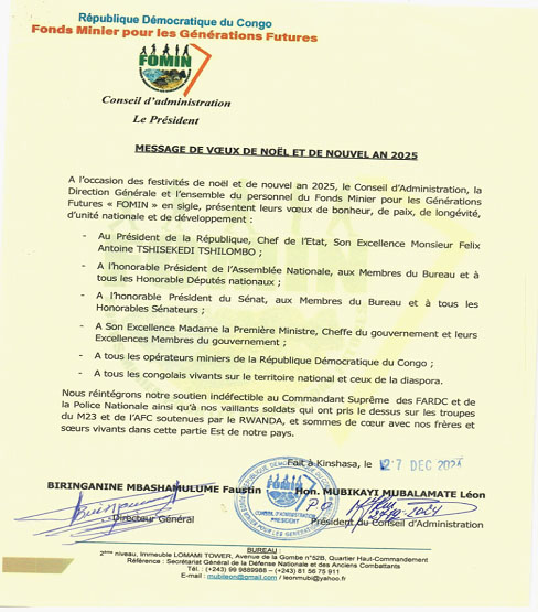 A l'occasion des festivités de Noël et de Nouvel an 2025, le Conseil d'Administration, la Direction Général et l'ensemble du personnel du Fonds Minier pour les Générations Futures " FOMIN " en sigle, présentent leurs vœux de bonheur, de paix, de longévité, d'unité nationale et de développement :