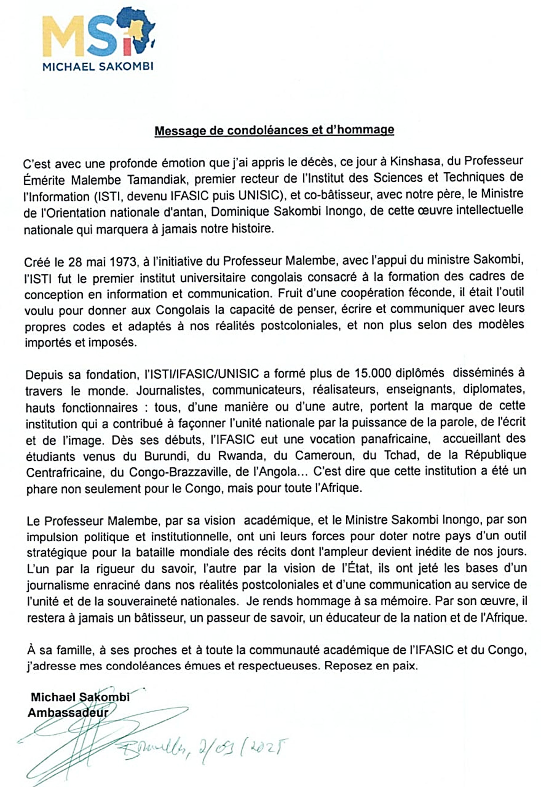 Michael Sakombi rend hommage au Prof Emérite Malembe Tamandiak, co-bâtisseur de l'Isti/Ifasic/Unisic avec Dominique Sakombi