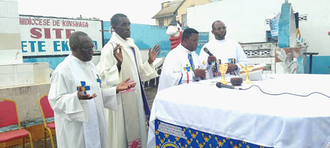Célébrée par l’abbé Octave Mayindu, Vicaire de la paroisse Saint Frédéric de Kimbanseke et représentant du Curé doyen, la messe a connu la participation de trois autres prêtres présents à Kinshasa : l’abbé Mbula du diocèse de Buta, l’abbé Teddy Massamba, vicaire de la paroisse saint Angel de N’Sele, et le Père Richard Nsimba de la paroisse Saint Clément.