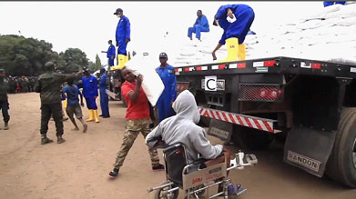 Il est un peu plus de 9 heures lorsque les premiers sacs de farine commencent à être déchargés. Une ambiance à la fois solennelle et fraternelle enveloppe l'enceinte. Mères de famille, jeunes recrues, blessés de guerre, retraités discrets, personnels civils… tous alignés, cartes en main, patientent dans le calme. Devant eux, quatre camions-remorques regorgeant de sacs de farine de maïs : 4 000 au total, conditionnés en sacs de 25 kg.