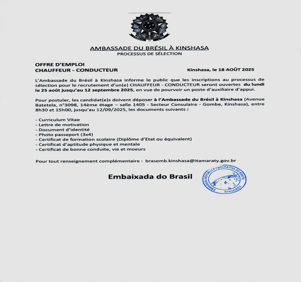 Offre d'emploi de l'Ambassade du Brésil à Kinshasa