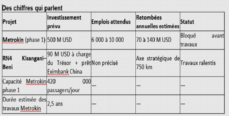 Cette instabilité mine la crédibilité internationale du pays et prive la population d'ouvrages indispensables à son développement. Notre média, Finance-cd.com, a mené une série d'enquêtes sur les chantiers annoncés tambours battants avant d'être, compromis, voire abandonnés en rase campagne souvent à cause de problèmes de capacités et de compétences des administrations et des autorités, d'une éthique défaillante à tous les niveaux, mais aussi parfois de simples égos des hommes au pouvoir. Dans cette première partie de notre enquête, nous présentons deux exemples emblématiques : le projet Métrokin et la construction de la route Kisangani-Beni.