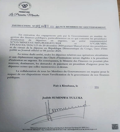 La Première ministre, Judith Suminwa via une correspondance datée du mercredi 05 février, a instruit tous les membres du Gouvernement à se passer dorénavant, des demandes de paiement en procédure d'urgence pour les dépenses. Seules les dépenses aux opérations sécuritaires et aux déplacements urgents des Chefs des institutions seront éligibles à la procédure d'exécution en urgence.