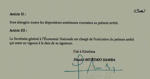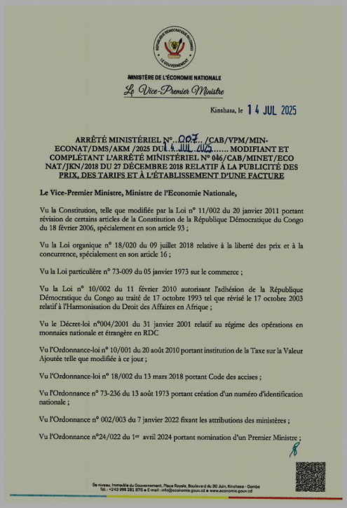 Il l'a décidé il y a trois mois environ, il revient sur sa décision pour matérialiser sa mise en oeuvre. Le vice-Premier ministre, ministre de l'Economie Nationale, Daniel Mukoko Samba - c'est de lui qu'il s'agit - a procédé, le 14 juillet 2025, à la signature de l'Arrêté ministériel 007/CAB/VPM/MINECONAT/DMS/AKM /2025 du 14 juillet 2025, modifiant et complétant l'arrêté ministériel N°046/CAB/MINET /ECONAT/JKN/2018 du 27 décembre 2018 relatif à la publicité des prix, des tarifs et à l'établissement d'une facture. Il est publié dans le Numéro Spécial du Journal Officiel du 14 août 2025.