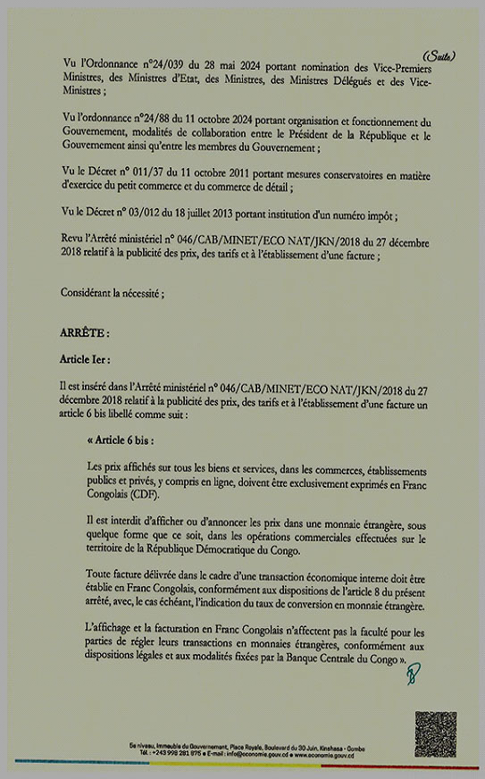 Au terme de cet Arrêté, le Ministère de l'Economie Nationale renforce la souveraineté monétaire de l'État en instaurant une obligation claire d'afficher et de facturer les biens et services exclusivement en Franc Congolais (CDF), tout en préservant les équilibres économiques.