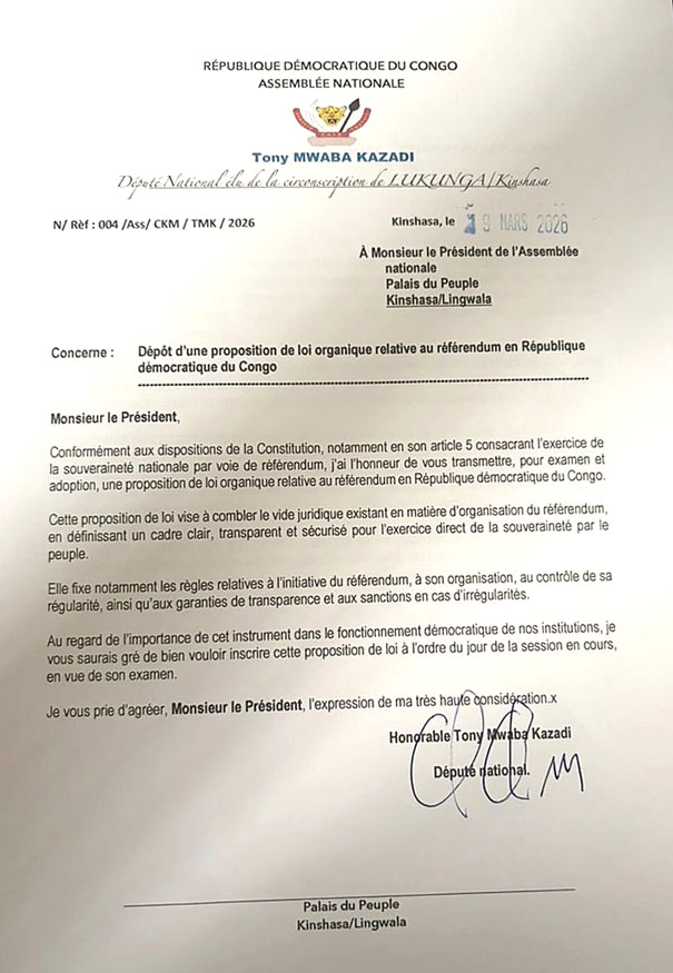 En déposant à l’Assemblée nationale une proposition de loi organique sur le référendum, le député national Tony Mwaba Kazadi a réveillé un débat que beaucoup pensaient assoupi. Dans un climat politique déjà traversé par les discussions sur la révision constitutionnelle, cette initiative remet brutalement au centre de l’arène une question explosive : le référendum pourrait-il un jour ouvrir la voie à un «déverrouillage» de l’article 220 de la Constitution, pilier de la limitation des mandats présidentiels ?
