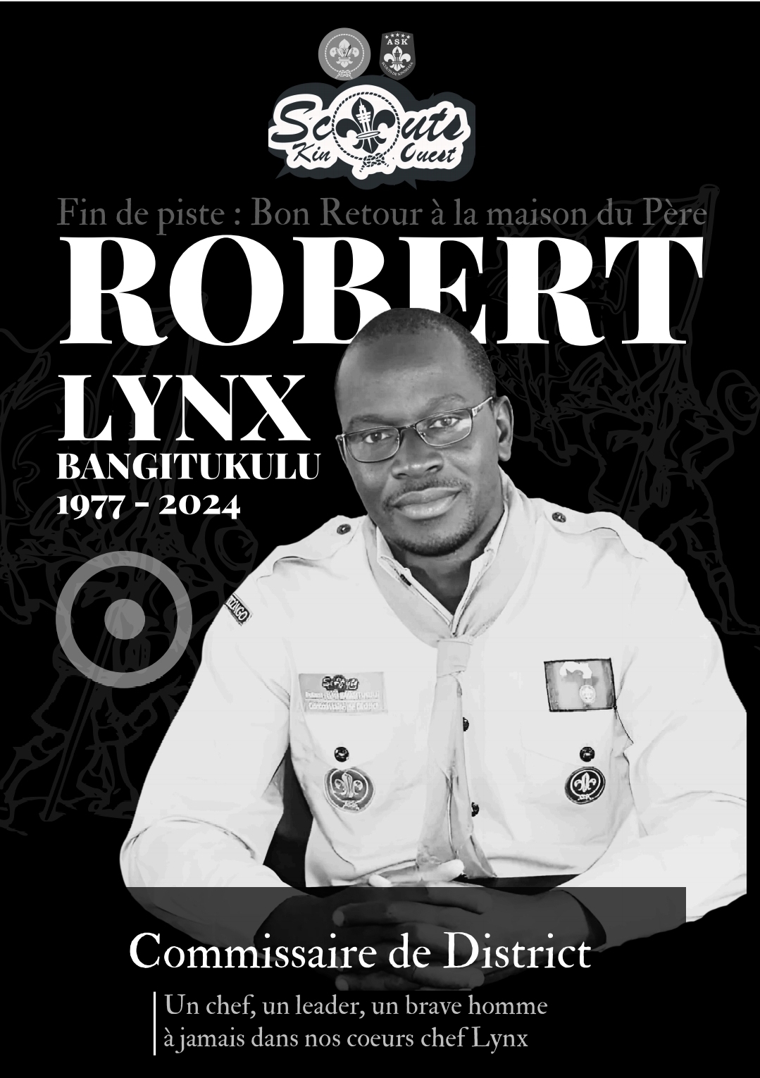 J'ai connu le chef Robert Lynx Bangitukulu depuis le 6 février 2021. Il fut un chef chevronné qui a beaucoup contribué et investit dans les scouts. Il a travaillé notamment pour les scouts protestants, sans distinction des communautés de l'Eglise du Christ au Congo (ECC).