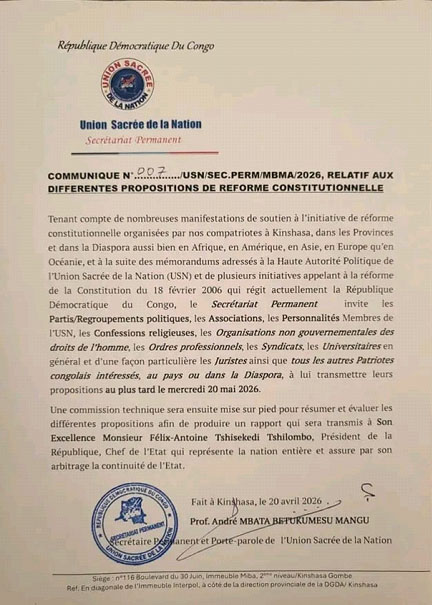 Dans cette perspective, l'Union Sacrée invite un large éventail d'acteurs à prendre part à ce processus. Partis politiques, organisations de la société civile, confessions religieuses, universitaires, syndicats, ONG de défense des droits de l'homme, ainsi que juristes et autres citoyens congolais, qu'ils résident au pays ou à l'étranger, sont appelés à soumettre leurs propositions au plus tard le 20 mai 2026.
