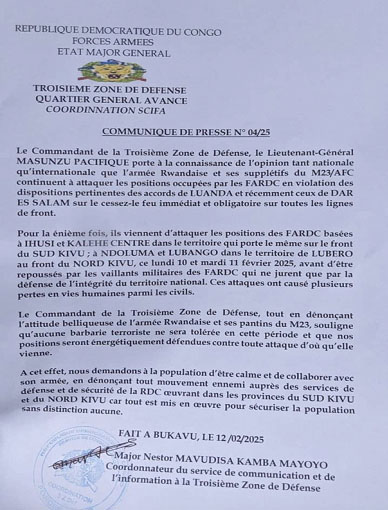 La troisième zone de Défense des Forces armées de la République démocratique du Congo (FARDC) a publié un communiqué mercredi 12 Février dénonçant les attaques menées par l'armée rwandaise et ses supplétifs du M23/AFC contre les positions des FARDC dans les provinces du Sud-Kivu et du Nord-Kivu.
