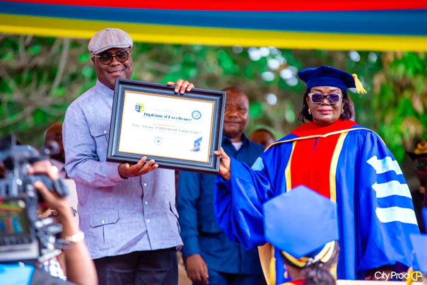 Le Comité de gestion de l’Université pédagogique nationale (UPN) a décerné lundi 19 décembre, au Président, Félix Tshisekedi, le «Prix d’Excellence du Champion de l’Education», à l’occasion de la cérémonie d’inauguration de la deuxième phase des infrastructures construites et rénovées sur le campus de cette Alma mater. Ce Diplôme d’Excellence lui est décerné en reconnaissance de ses mérites dans le domaine de l’Education. Ce n’est pas tout. L’UPN et son Comité de gestion ont également gratifié le Chef de l’Etat d’une autre distinction, à savoir : la «Grande médaille d’or».