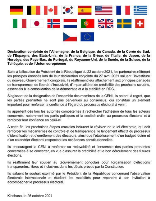 Dans une déclaration conjointe signée hier, mardi 26 octobre, l’Allemagne, la Belgique, la France, le Canada, les Etats-Unis, la Corée du Sud, le Royaume-Uni, le Japon, la Suède, la Norvège, la Grèce, l’Italie, le Pays-Bas, le Portugal, la Tchéquie, l’Espagne, la Suisse ainsi que l’Union européenne, encouragent la CENI à renforcer sa redevabilité et l’ensemble des parties prenantes à se concerter, en vue d’assurer la crédibilité et le bon déroulement des futures élections.