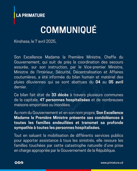 À la suite des fortes pluies qui se sont abattues sur Kinshasa entre le 4 et le 5 avril 2025, le gouvernement congolais a dressé un lourd bilan provisoire : 33 personnes ont perdu la vie, 47 ont été hospitalisées et de nombreuses habitations ont été détruites ou inondées. Dans un communiqué officiel publié hier lundi 7 avril, la Première Ministre a présenté ses condoléances aux familles endeuillées et a assuré une prise en charge des sinistrés par les services compétents.