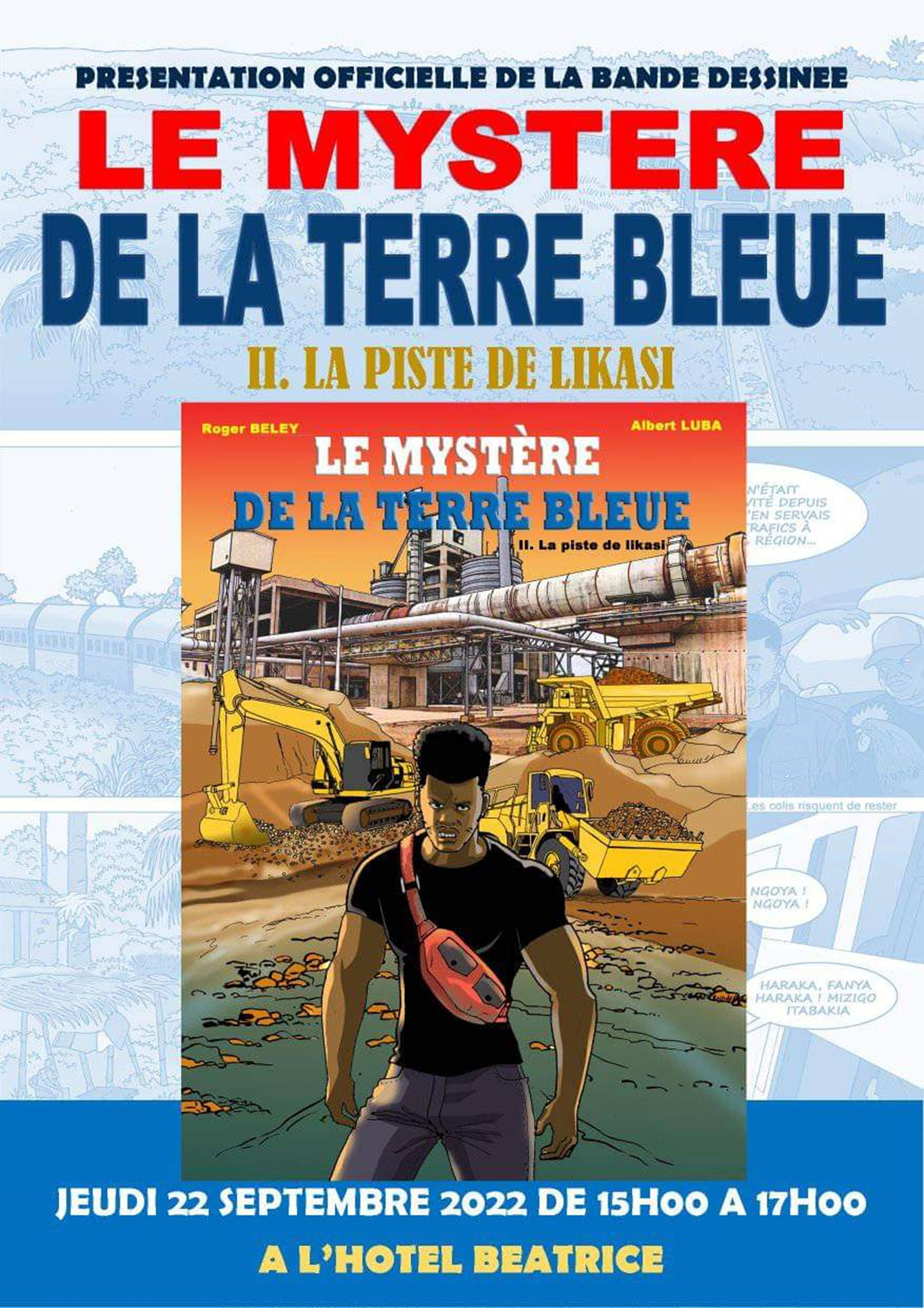 Le scénariste congolais Roger Beley et le dessinateur Albert Luba présentent, ce jeudi 22 septembre, le tome 2 de la bande dessinée ‘‘Le mystère de la terre bleue’’. Une histoire fictive basée sur les enjeux de la production et de l’exploitation du cobalt en République démocratique du Congo.